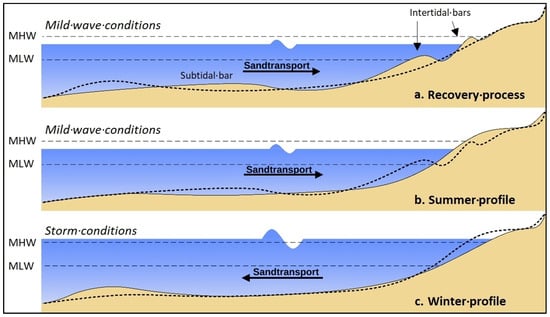 Cross-shore variability during the recovery phase (a) from a winter profile (c), to a summer profile (b) with the solid line indicating the profile at the described stage and the dotted line indicating the profile at the previous stage. MHW and MLW indicate the mean high and low water, respectively.