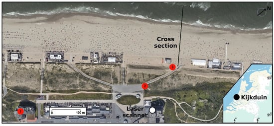 Overview of the Kijkduin study area with the laser scanner and cross-section used in the analysis. Red points (numbered 1–3) indicate the reference object locations used for georeferencing (see Section 2.2).