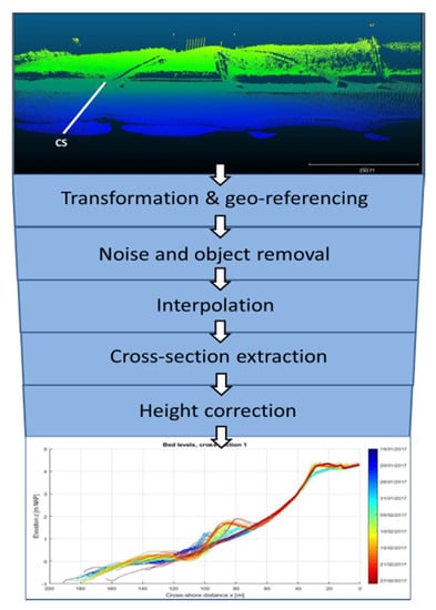 Data were processed in a five-step procedure, visually represented in Figure 3. As a first step, data were georeferenced and aligned based on three ground control points (GCP, see Figure 2 and Figure 4) [36,37]. These GCPs consisted of a building wall to the south of the scanner and two information signs in the dunes. The alignment correction angles were determined by minimizing the distance between the GCP’s of the first and subsequent nth scan with nonlinear regression [38]. After cropping of the scan around the cross-section, the data were cleaned from noise and objects with the LasTools software [39]. A box (step) size of 2 m and isolated point count threshold of eight was used for the noise. As a final step, the data were interpolated to fill in any gaps and to obtain the cross-sections.