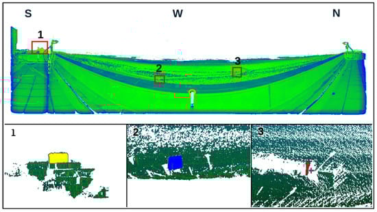 (Top image) Spherical view of a Kijkduin point cloud (colored according to reflectance) with a south-west-north orientation. The edge of the roof can be seen in the foreground, while the observed part of the coast up to the water line is in the background. Low surface reflectance is indicated by blue colors while high surface reflectance is indicated by green colors; (Bottom image) Detailed images of the reference objects (see Figure 2 for the locations) in the surrounding of the building, to the south of the laser scanner (1), part of a neighboring building and to the West (2), information sign and north-west of the laser scanner (3), sign on a post (modified from Vos et al., 2020).