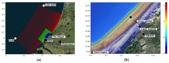 (a) Nested grids used for the calculated wave conditions (coordinates in degrees N and E). Wave boundary conditions were provided by the Europlatform (EUR) and IJmuiden Munitie Stortplaats (IJM MSP) wave buoys and wind data were provided at Hoek van Holland (HVH); (b) Local wave grid near Kijkduin with water depth indicated in color (red (0 m NAP) to blue (−10 m NAP.) and with the wave output point at −3 m NAP. relative to the analyzed cross-section and the laser scanner.
