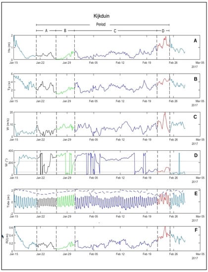 Figure 6 shows the calculated wave data at Kijkduin in the period from 15 January to 28 February 2017. It shows the wave height and wave peak period next to the local wind conditions (wind speed and wind direction), the local tidal elevation, and the tidal range and run-up. Results will further be discussed in the next section.