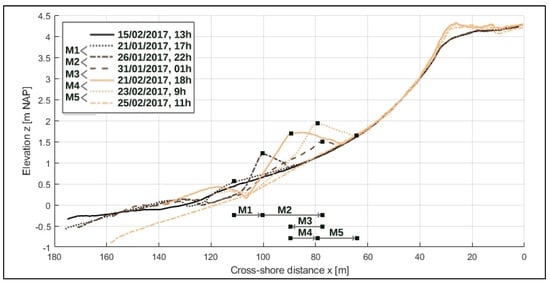 Bed levels of 7 selected low water periods, from 15 January to 25 February 2017. The changes around 20–30 m (cross-shore distance) are caused by bulldozers flattening the beach for the tourist season. The detected movements of the intertidal bar (M1–M4) are indicated with arrows. M5 indicates the destruction of the bar.