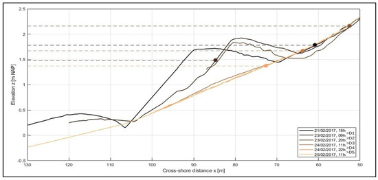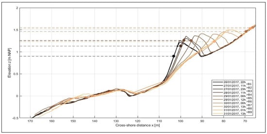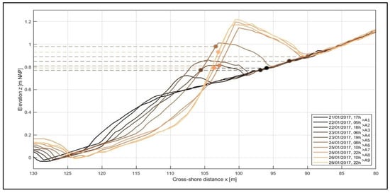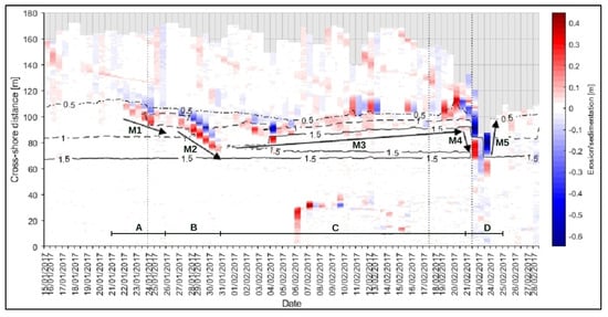 Figure 8 shows a sedimentation and erosion stack plot based on all available low water scans, where the height differences per tidal cycle in the cross-shore direction are derived. Despite some missing low water periods (indicated with a vertical dotted line), sedimentation and erosion patterns are clearly visible in time. The distinctive intertidal-bar changes (Figure 7) can be observed in the stack plot (Figure 8), indicated by the arrows identifies as M1–M5. Especially, the strong onshore movement from 26 January to 31 January (M2) and the destruction of the bar (M5) around the 24 February is clearly visible. The widening of the bar is, except from two or three clear occurrences, less visible.