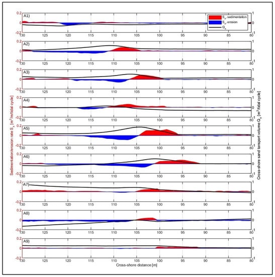Sedimentation and erosion rate, Sx, and cross-shore sediment transport volumes, Qx, in the period A from 21 to 26 January 2017 (A1–A9, see Figure 9) based on tide-to-tide beach height differences (Subplot 6 shows the rates for two tidal periods due to a gap in the available data). Positive/negative Qx values indicate shoreward/seaward sand transport, respectively.