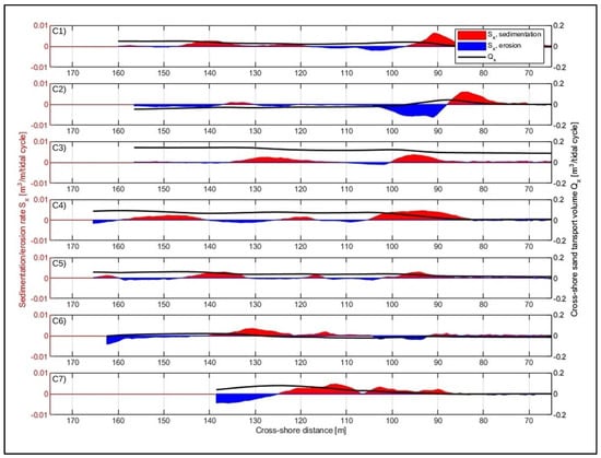 Sedimentation and erosion rate, Sx, and cross-shore sediment transport volumes, Qx, in period C from 31 January to 21 February 2017 (C1–C7, see Figure 13) based on tide-to-tide beach height differences. Positive/negative Qx values indicate shoreward/seaward sand transport, respectively.