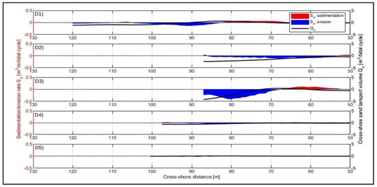 Sedimentation and erosion rate, Sx, and cross-shore sediment transport volumes, Qx, in period D from 21 to 25 February 2017 (excluding 22 February) (D1–D5, see Figure 15) based on tide to tide beach height differences.