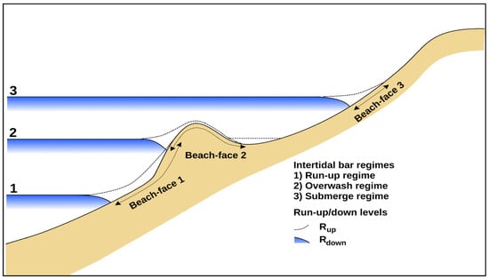 Depending on the water level with respect to an intertidal bar crest elevation, both surf zone and swash-zone processes can be dominant for the morphological behavior. For the conceptual model developed here, this relative water level is categorized into the three intertidal bar regimes as presented in Figure 17 and inspired by the storm impact regimes proposed by Sallenger [44]. During relatively low water levels, the run-up regime prevails, where the run-up level (Rup) remains below the bar crest. When the relative water level increases and the run-up level gets above the bar crest, the overwash regime is reached. Swash-backwash processes [1,14,45] are identified in this regime as driving forces for the generation and shoreward movement of the bars. Finally, for a relatively high water level, the submersion regime prevails, when the rundown level is also above the bar crest. For energetic wave conditions, the beach face, then, tends to be flattened due to a strong undertow, resulting in a net offshore sediment transport [6,45].