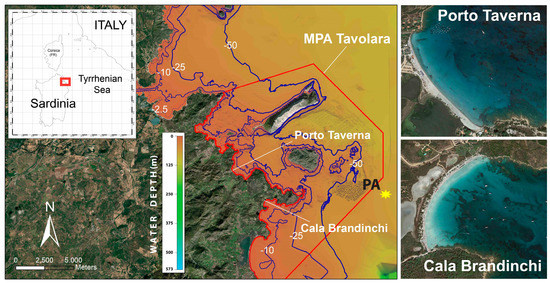 Location of the Porto Taverna and Cala Brandinchi beaches within the marine protected area (MPA) Tavolara Punta Coda Cavallo located in the Eastern Sardinian coast facing the Tyrrhenian Sea.