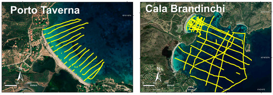 Bathymetric surveys carried out for the two study sites. Yellow lines indicate the tracks followed to map the seabed by mean of the single-beam echo sounder.
