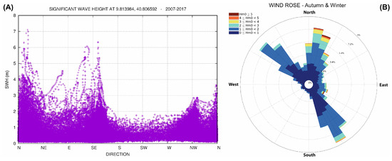 The typical wave regimes characterizing the study sites were analysed in terms of incident wave energy, direction, and number of events in order to individuate a satisfactory number of scenarios that could characterize the local wave climate. Specifically, the authors selected an eleven-year period (2007–2017) of wave data that were produced at hourly frequency by the back-testing of the Mediterranean Waves Forecasting System [19], released by the EU ocean data provider Copernicus (see https://marine.copernicus.eu for further information) and collected at 40.843462° E and 9.809011° N, a point located offshore both the study sites (see PA in Figure 1). In Figure 3, panel A, a scatter plot describes the relation between the significant wave height (SWH) and the wave direction (D) for the whole set of data.