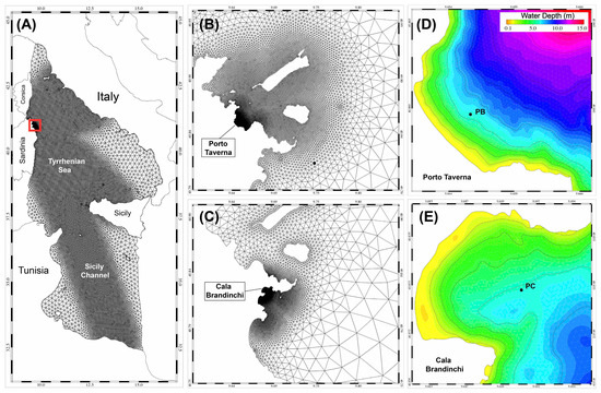 Finite element meshes representing the model domains. Panel (A) represents the whole domain reproduced by one of the two meshes, panels (B,C), the zooms for the Porto Taverna (PT) and Cala Brandinchi (CB) sites, and panel (D,E), the bathymetric details.