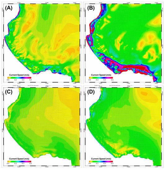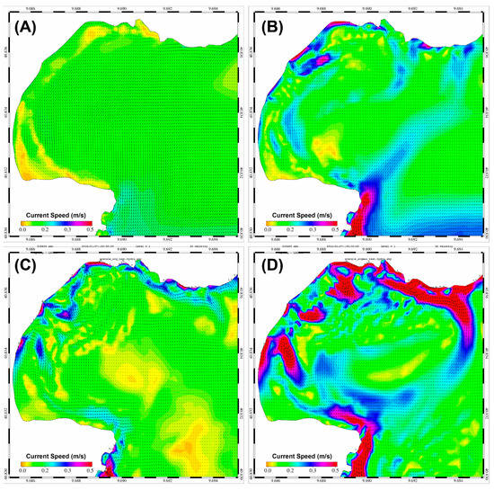 Vertically averaged water circulation in the CB bay as being obtained by each forcing scenario at the highest energetic moment. Panels from (A–D) refer to ST_G1, ST_G2, ST_S1, and ST_S2.