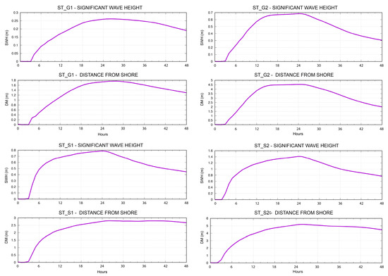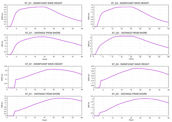 The model was applied to reproduce the wave and currents fields in the two study sites for the four different meteo-marine scenarios described in Table 2, two for Grecale (ST_G1 and ST_G2), and two for Sirocco wind regimes (ST_S1 and ST_ S2). For all the cases, the synthetic wind forcing, described in Section 2.2.1 with speeds and directions obtained from previous analysis, were applied to guarantee a comparison among the scenarios results. In Figure 5 the SWH distribution was reported for each scenario as reproduced by the model for the first 2 days of the whole simulated period at the offshore location in front of both study sites. The linear increasing in time of the wind intensity generates an asymptotic increment of the wave height up to the end of the 1st day of simulation then decreasing to 0 at the end of the 3rd day of simulation. The maximum SWH values were 1.55 m (ST_G1) and 3.51 m (ST_G2) for the Grecale scenarios and 1.21 m (ST_S1) and 2.48 m (ST_S2) for Sirocco scenarios with, constant directions of 37° and 155° for Grecale and Sirocco cases, respectively.