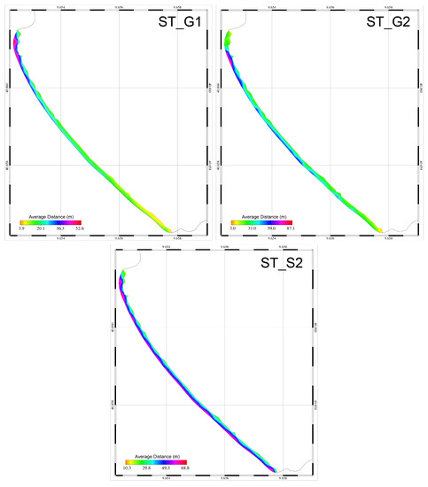 Spatial distribution of the average distances travelled by particles released along the shoreline. Results are obtained from ST_G1, ST_G2, and ST_S2 for the PT study site.