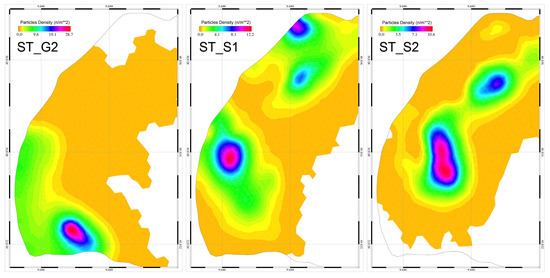 Spatial distribution of the average particles density at the seabed. Results are obtained from ST_G1, ST_G2, and ST_S2 for the PT study site.