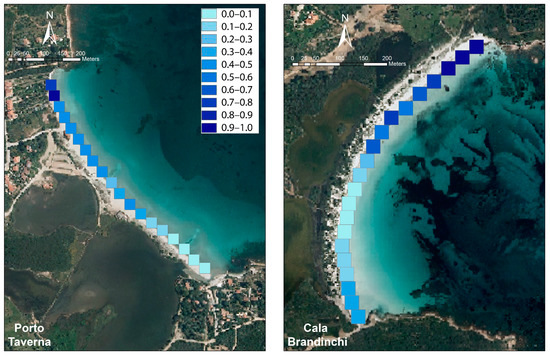 With these premises, this study aims to identify the most suitable areas for autumnal repositioning of the P. oceanica leaves for two beaches, Porto Taverna (PT) and Cala Brandinchi (CB; see Figure 1), located within the marine protected area (MPA) of Tavolara Punta Coda Cavallo, along the eastern coast of Sardinia Island. The MPA was established on the 12th December 1997 by the Italian Ministry of Environment and extends for a total surface of 15,280 ha, including several coastal marine habitats with P. oceanica meadows, rocky outcrops, coralligenous assemblages and sandy muddy bottom mainly characterizing the MPA seabed [16]. Coastal geomorphology is characterized by granite of Ercinic origin with several sandy beaches, including pocket beaches, enclosed in the MPA [17].