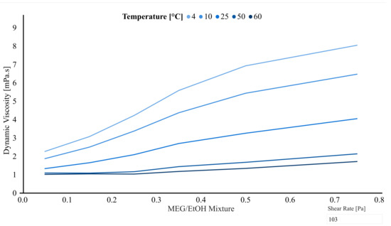 Table 5 shows a representation of the results we obtained in this research. Considering the volume of the results, only the results for a single temperature and a single shear rate with changing concentration of MEG/EtOH mixture are being presented. The other results are shown in Figure A1 on Appendix A.