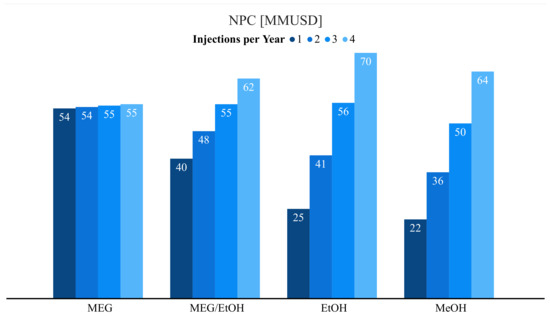 In this study, we used the NPC for different chemical treatments as the economic comparative parameter. The cost of methanol was based on the quantity needed for the treatment [10]. Meanwhile, for the cost of the MEG, it was necessary to consider the regeneration process that occurs after each injection [10]. In short, all methanol would be spent but not all the MEG would. Only a small percentage of it would be considered as a margin for losses [10]. In the case of ethanol, the costs were based on the quantity of ethanol that would cause the same decrease on temperature as a quantity of methanol. Using Equation (1) we were able to approximate that 30% ethanol could cause a similar effect as 20% methanol. This information was used to simulate and compare the cost of a methanol treatment with the cost of ethanol treatment. This method was used to approximate the quantity of ethanol, as there is not enough data for ethanol to use with common software to determine the quantity of THI needed. To determine the cost of the MEG/EtOH mixture, the quantity of MEG in the mixture, the MEG regeneration and the quantity of ethanol in the mixture was considered. Even though the ethanol could be distilled from the water, this process is yet to be considered. We used a MEG, methanol and ethanol price of 900, 400 and 360 USD/MTon, respectively.