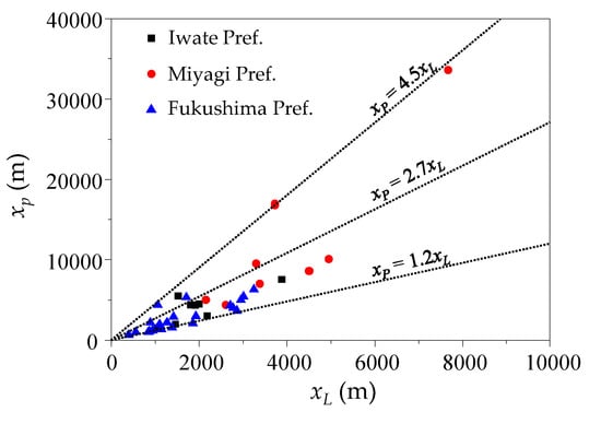 3.2. Relationship of Tsunami Intrusion Distance in River and Land Area