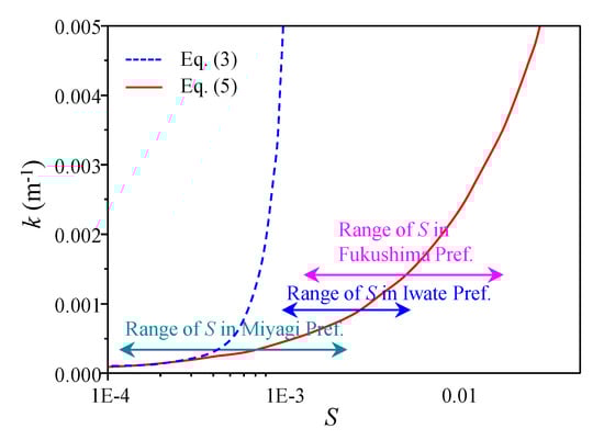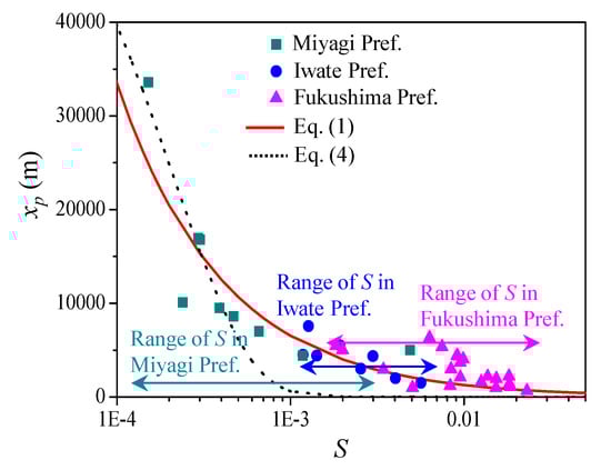 - Based on the comprehensive data compilation, new empirical equations were obtained for calculating the damping coefficient and tsunami intrusion distance using the riverbed slope. The new equation results compared well with the measured data in three prefectures in Tohoku District. The new equation forms are similar to the equations by Tanaka et al. [3], but the present equations cover a wide range of river morphologies and geometries. Therefore, as compared with the previously proposed equation by Tanaka et al. [3], the applicability of the present equations will be higher. However, further verification of will be required by adding more data based on field observations, numerical experiments, and laboratory experiments.