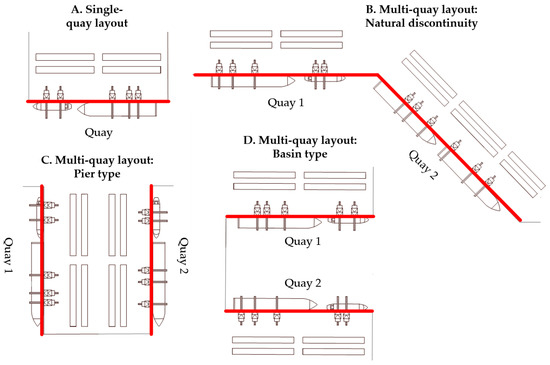 Instead of one long quay, a terminal with more discontinued quays may form different layouts. Quays may be constructed as a pier type, basin type, or natural type following the shoreline shape (Figure 1). Different layouts imply distinct approaches to solving basic seaside tactical logistic problems: the berth allocation problem (BAP), the quay crane allocation problem (QCAP), and the quay crane scheduling problem (QCSP). Due to the seaside operations that are considered to be most important for shipping operators because of their high impact on vessels’ service time in ports, the methods and models of optimization developed in the last few decades aim to improve and facilitate relevant decisions: namely, the decision of when the ship will be berthed, on which berth, how many quay cranes will be assigned to the vessel, and in which way the handling process will be shared between assigned cranes.