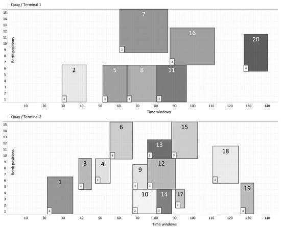 Since we consider the problem with a multi-quay layout, Figure 3 shows a ship-to-berth assignment solution for two quays/terminals where each quay has an equal chance of selecting. Therefore, no preference has been set. In this example, 20 ships were candidates for berth assignment in a period of more than 140 time windows (let us say that 1 time window equals 1 h). Since we are considering small and medium-sized terminals, a total of 15 berth segments (or simple berths) were placed on each quay where each berth segment occupies approximately 50 m. In the real world, the safety distance between adjacent ships must be considered, but it has no bearing on the problem’s solution since it is a constant value. Therefore, each quay has a length of 750 m or a total of 1500 m.