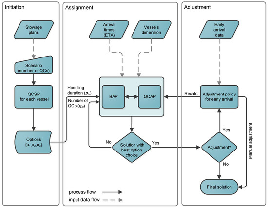 The prediction calculation of the processing time during the handling process is the main challenge for berth-to-vessel and crane-to-vessel assignments. Following the philosophy of the integrated problem solution proposed in [22,23], we developed a methodology for the complete solution for BAP, QCAP, and QCSP enabled by an optimization process. This optimization process consists of three main stages: initiation, assignment, and adjustment (Figure 4). It is acceptable for most small and medium-sized ports where resource availability and handling performances are most important to liner shipping operators.