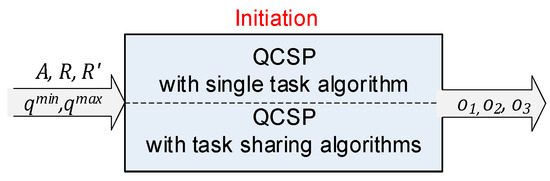 It is necessary to define the number of cranes q before each QCSP solving. The minimum number of quay cranes qimin for each ship is usually subject to a contract between the terminal operator and the shipping company, and it is requested by the latter. The maximum number of quay cranes qimax depends on the container stowage plan. In cases where q = 1, the problem is limited to solving a single sequence of tasks. In other cases, the QCSP output is a task-to-crane assignment and the total makespan, or processing time pi is required for the completion of handling operations. The inputs for the model include a set of individual tasks during the cargo loading and discharging, marked with A, and sets of task sequences, marked with R, R′ (Figure 5) according to Kim and Park [49].