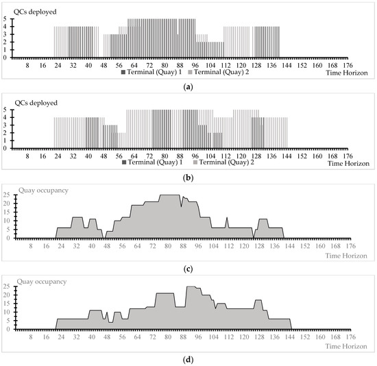 A multiuser CT usually operates as a common user terminal, offering service to any shipping lines without priorities. On the other hand, there are CTs dedicated to specific shipping lines where priority exists. A combination of those two operating principles within the context of berth allocation problem solving is studied in [35,36]. The idea is that when extensive traffic is present, a terminal operator of a multiuser CT can divert a vessel to an external (dedicated) container terminal. The proposed model minimizes the total vessel service cost from the perspective of terminal operators. Hendriks et al. [37] considered a single terminal operator who provides a terminal operation service at more than one CT located within the same port area. They set two objectives: to balance the QC workload over the terminals and over time and minimize inter-terminal container transport. However, unlike in [35], the model’s implementation is not focused on the high-demand period but rather the costs associated with each operating quay crane and container transported from one terminal to another. This approach is interesting compared to recent research and models aiming to reduce the energy consumption and high workload of quay cranes.