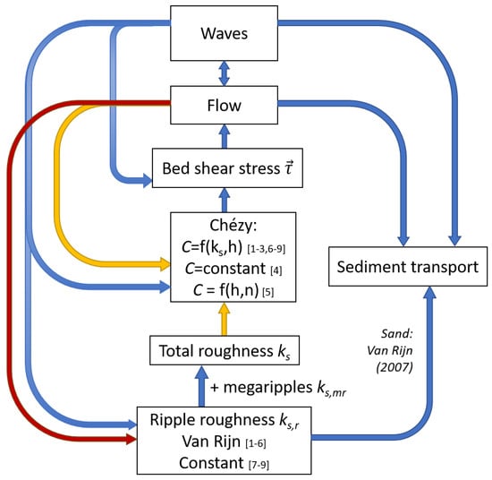 Schematic overview of interaction and feedbacks related to ripples and megaripples in Delft3D. The numbers refer to the scenarios explained in Section 2.3. Yellow arrow: this effect is removed by choosing a constant Chézy value C (scenarios 4–5, note that sediment transport in this case still depends on ). Red arrow: this effect is removed by choosing a fixed ripple roughness (scenarios 7–9).