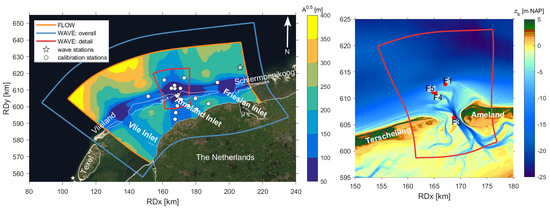 (Left): extent of the model grids, including grid cell sizes (given by the square root of the grid cell area A) of the FLOW model. (Right): zoom of the model bathymetry at the Ameland Inlet and locations of the measurement frames (F1–F5).