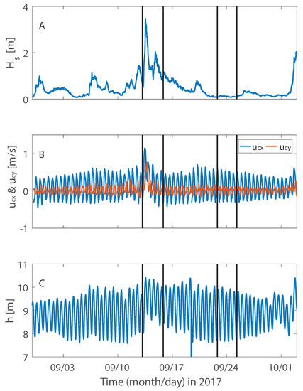 Hydrodynamics as measured at Frame 5. (A): significant wave height. (B): east () and north () component of the depth-averaged current velocity. (C): water depth. Black lines indicate the representative storm and calm period described throughout this paper.