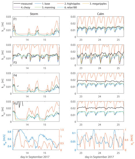 Top four rows: modelled total bedform roughness through time at all frame locations (F1, F3, F4 and F5) during the storm (left) and the calm (right) period as denoted in Figure 3. Bottom row: modelled near-bed orbital velocity and depth-averaged current velocity magnitude at Frame 1 during the storm (left) and the calm (right) period.