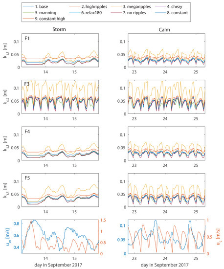 Two time periods were considered in this study: (1) a 36-h period of calm weather and (2) a 36-h period of storm conditions (Figure 3). These periods were chosen in such a way that water levels at the beginning and end of each period were the same, which is one of the ways to define a tidal period or multiples thereof [34]. On top of that, various environments were studied, varying from the current-dominated tidal channel to the wave-current dominated ebb-delta shoals. This facilitated in determining the sensitivity of hydrodynamics and sediment transport to ripple-related bedform roughness in various conditions. Because the model was not validated for sediment transport, we focused only on relative changes and absolute transport values are not discussed. The sensitivity in the tidal basins was not considered either, because neither hydrodynamics nor sediment transport were validated here, and the potentially high mud concentrations could result in different processes than considered by the present model.