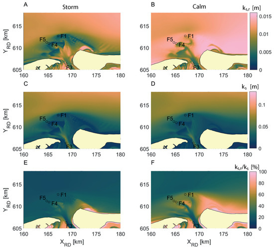Modelled ripple roughness (A,B), total roughness (C,D) and ripple roughness as a percentage of total roughness (E,F) averaged over time during the storm (left) and the calm (right) period as denoted in Figure 3 in scenario 1.