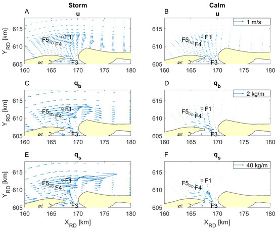 Time-averaged value of depth-averaged current velocity magnitude (A,B), time-integrated bedload transport (C,D) and time-integrated suspended load transport (E,F) during the storm (A,C,E) and the calm weather period (B,D,F) on a select number of model grid points.