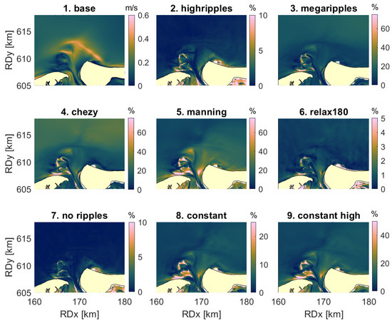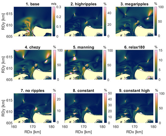 Mean depth-averaged current velocity (m/s) of the base scenario during the storm (1), and mean absolute relative difference in of all other scenarios with the base scenario during the storm (2–9).