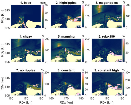 Time-integrated bedload transport during the storm (1), and absolute relative difference in of all other scenarios with the base scenario during the storm (2–9).