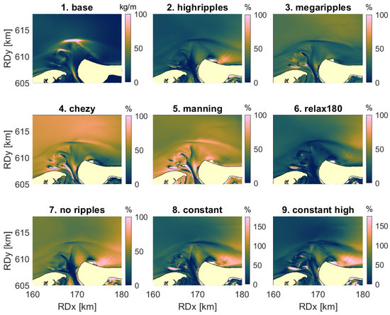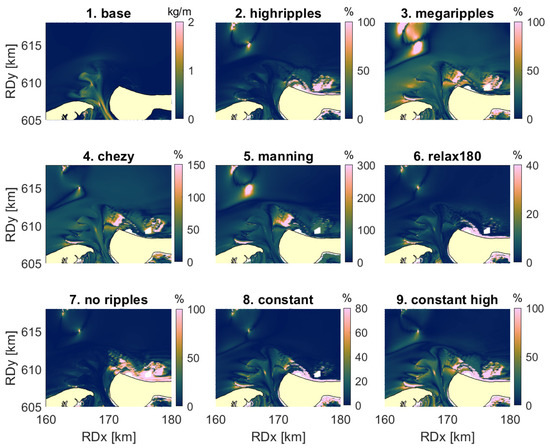 Time-integrated bedload transport during calm weather (1), and absolute relative difference in of all other scenarios with the base scenario during calm weather (2–9).