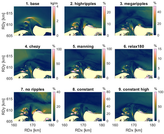 Time-integrated suspended load transport during calm weather (1), and absolute relative difference in of all other scenarios with the base scenario during calm weather (2–9).
