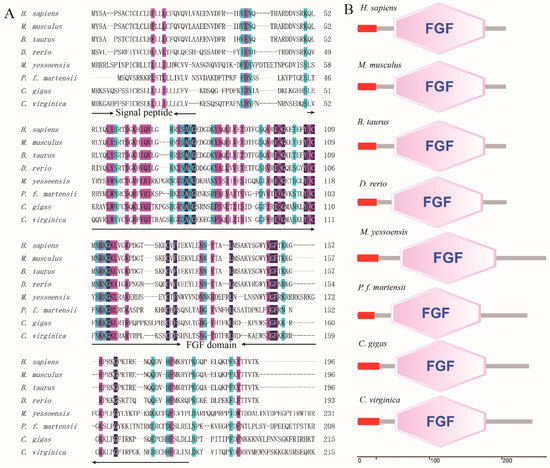 Multiple sequence alignment and structural organization of PmFGF18 amino acid sequence and other species. (A) shows the multiple sequence alignment of PmFGF18. Dark blue background indicates conserved aa; pink background indicates aa with strong similarity; light blue indicates aa with weak similarity. The numbers on the right present the total amino acid of each protein. (B) represents the structural organization of FGF18 among different species. The red region represents the signal peptide. Accession number for the sequences used in this alignment and domain analysis are as follows: C. gigas (XP_011453678.1), C. virginica (XP_022288219.1), M. yessoensis (OWF47747.1), H. sapiens (AAC62240.1), M. musculus (AAC62239.1), D. rerio (AAQ22394.1), and B. taurus (AAI20281.1).