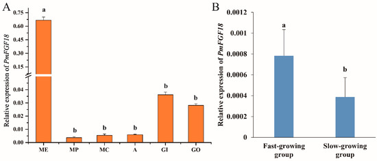 Expression pattern of PmFGF18 from P. f. martensii. (A) Expression pattern of PmFGF18 in different tissues. ME: Marginal zone of mantle; MP: Pallial zone of mantle; MC: Central zone of mantle; A: Adductor muscle; GI: Gill; GO: Gonad; Different letters indicate significant differences (P < 0.05) determined through one-way ANOVA, and the bar represents the standard deviation. (B) Expression pattern of PmFGF18 in the fast- and slow-growing groups. Bars with different letters indicate significant differences (P < 0.05).