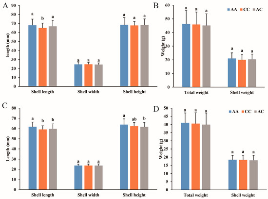 SNP g.50918198A > C verification in two lines. (A,B) and (C,D) showed the result of the “Haixuan NO1” and yellow shell color line, respectively. Bars with different letters indicate significant differences among different genotypes (P < 0.05).