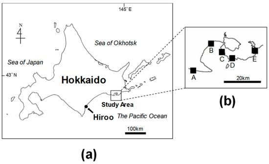 (a) The study area on Hokkaido, Japan. Hiroo was the eastern front of the area invaded by Balanus glandula in 2000 [10]. (b) Map showing the studied shores.