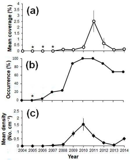 Temporal changes in (a) coverage on control plots, (b) occurrence (presence or absence) on control plots, and (c) annual recruitment density on recruitment plots for Balanus glandula in eastern Hokkaido during 2004–2014. Vertical bars indicate standard errors. Asterisks (*) indicate that no B. glandula were detected.