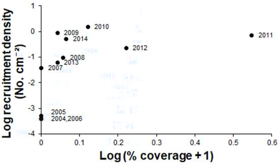 Temporal variations in the relationship between mean coverage and mean annual recruitment density of Balanus glandula in eastern Hokkaido during 2004–2014.
