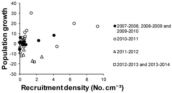 Relationship between annual recruitment density and population growth of Balanus glandula at each plot along the coast of eastern Hokkaido during 2004−2014. Population growth was estimated as the change in coverage between year t − 1 and year t each site.