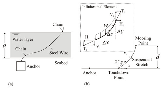 Illustration of the line segments adopted in the present problem and the forces acting in the catenary mooring line’s infinitesimal element: (a) global view, (b) forces acting in the infinitesimal element of the line.