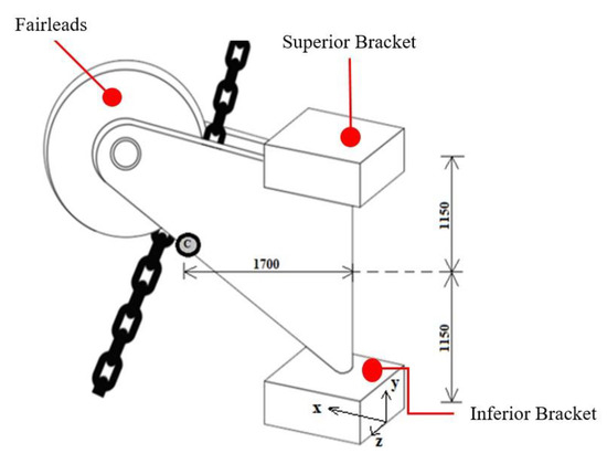 The SM system has several structural elements and pieces of equipment that interact directly and indirectly with the mooring line and are responsible for releasing and retracting the mooring line chains. Among the components, it is possible to mention the fairlead/bracket set. This set functions to absorb the horizontal forces acting on the line, thus preventing their effects over the equipment located on the mooring balcony [4]. The fairlead is a pulley attached to the hull by two foundations, called brackets. These structures are welded to the hull and responsible for determining all the equipment’s alignment in the system. They are usually robust structures composed of thick steel plates, with an around 40 mm thickness. It is worth mentioning that the brackets’ alignment directly affects the fairlead’s installation position, which is essential for installing the other equipment on the top of the vessel balcony. In Figure 1a, an illustration of the mooring system can be seen, and Figure 1b depicts the local view of the fairlead with the two brackets (inferior and superior) [1].